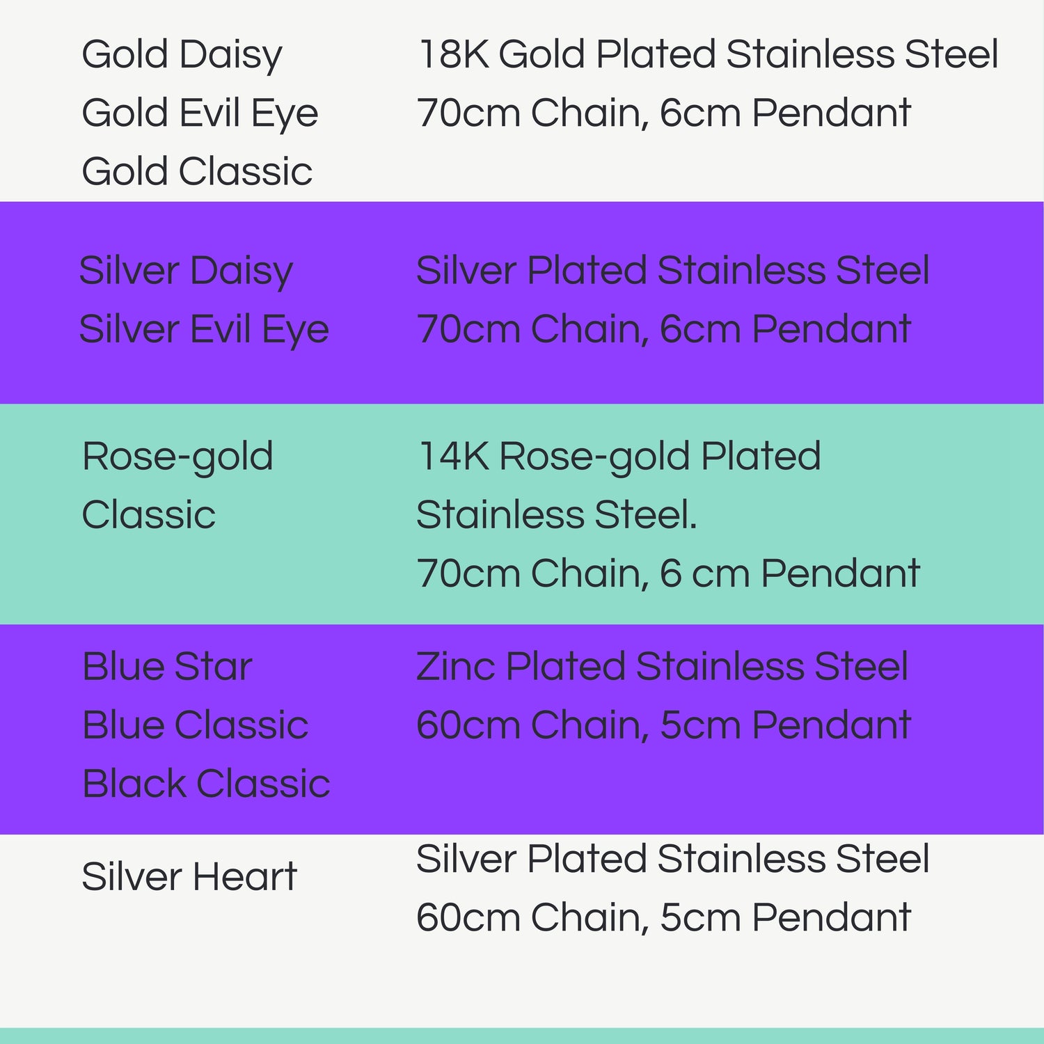 - Gold, Rose Gold, Gold Evil Eye, Silver Evil Eye, Silver Daisy: 70cm chain, 6cm pendant.